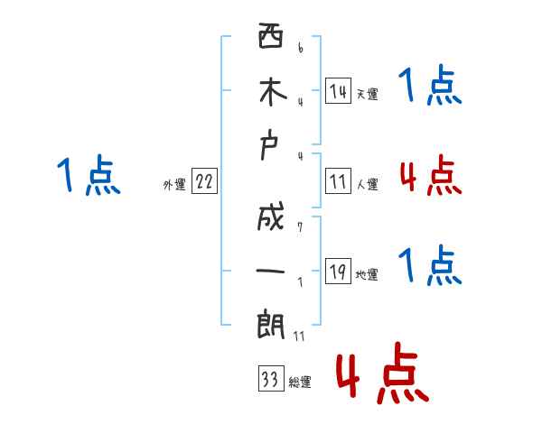 天運![]() | 西木戸成一朗さんの天運は14画の1つ星!人に対して優しいがストレスを溜め込みがち。人間関係のトラブルを避けるよう気をつけましょう。 家系が持つ宿命的な運勢を表します。祖先から受け継いだ苗字ですので自分の力が及びません。家柄を象徴します。 |