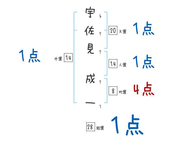 人運![]() | 宇佐見成一さんの人運は14画の1つ星!人に対して優しいがストレスを溜め込みがち。人間関係のトラブルを避けるよう気をつけましょう。 性格や才能などを表す2番目に重要な運勢です。人間関係や協調性、社会的な成功に影響します。主に20歳から50歳ぐらいまでの中年期の運勢を表します。 |