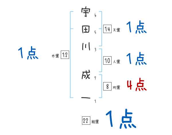 総運![]() | 宇田川成一さんの総運は22画の1つ星!努力することが苦手ないっぽう手先が器用。芸術性にも優れる。 あなたの人生を表す1番重要な運勢です。生涯を通じて影響する総合運となり、主に50歳以降の晩年期に影響を及ぼします。 |