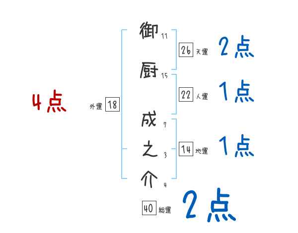 外運![]() | 御厨成之介さんの外運は18画の4つ星!情熱的で剛気。忍耐力があり信頼される。 生活面を象徴する運勢です。外部から受ける影響力を表し、結婚運、家庭運や職場、環境への順応性を表します。 |