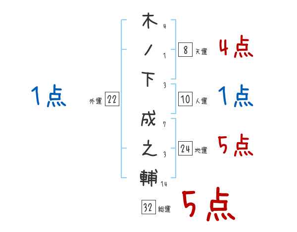 外運![]() | 木ノ下成之輔さんの外運は22画の1つ星!努力することが苦手ないっぽう手先が器用。芸術性にも優れる。 生活面を象徴する運勢です。外部から受ける影響力を表し、結婚運、家庭運や職場、環境への順応性を表します。 |