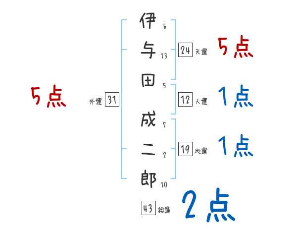 総運![]() | 伊与田成二郎さんの総運は43画の2つ星!頑固な性格で独立心が強いかも。やや非現実的で浪費に注意しましょう。 あなたの人生を表す1番重要な運勢です。生涯を通じて影響する総合運となり、主に50歳以降の晩年期に影響を及ぼします。 |