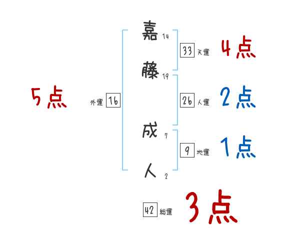 天運![]() | 嘉藤成人さんの天運は33画の4つ星!権力志向でプライドが高い。勇気があり運を切り開き成功する。 家系が持つ宿命的な運勢を表します。祖先から受け継いだ苗字ですので自分の力が及びません。家柄を象徴します。 |
