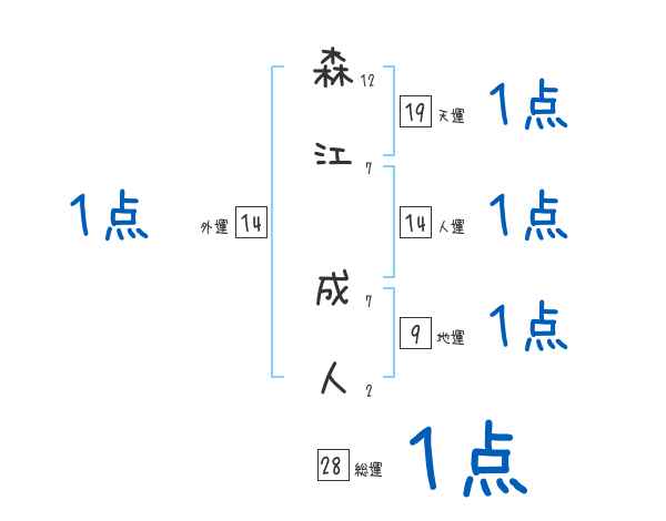 天運![]() | 森江成人さんの天運は19画の1つ星!優れた才能を持ちますが、協調性が足りないことも。周りの人と協力する事を意識しましょう。 家系が持つ宿命的な運勢を表します。祖先から受け継いだ苗字ですので自分の力が及びません。家柄を象徴します。 |