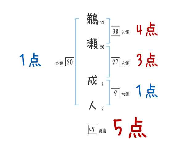 天運![]() | 鵜瀬成人さんの天運は38画の4つ星!温厚な性格で技術的な才能を発揮する。職人的な仕事に向いている。 家系が持つ宿命的な運勢を表します。祖先から受け継いだ苗字ですので自分の力が及びません。家柄を象徴します。 |