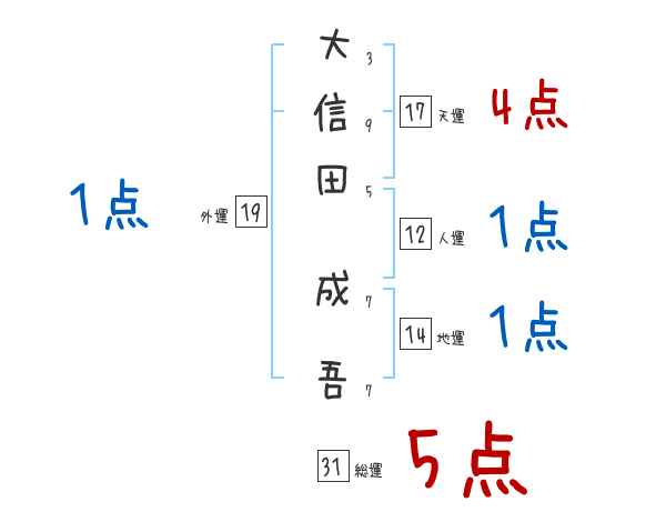外運![]() | 大信田成吾さんの外運は19画の1つ星!優れた才能を持ちますが、協調性が足りないことも。周りの人と協力する事を意識しましょう。 生活面を象徴する運勢です。外部から受ける影響力を表し、結婚運、家庭運や職場、環境への順応性を表します。 |