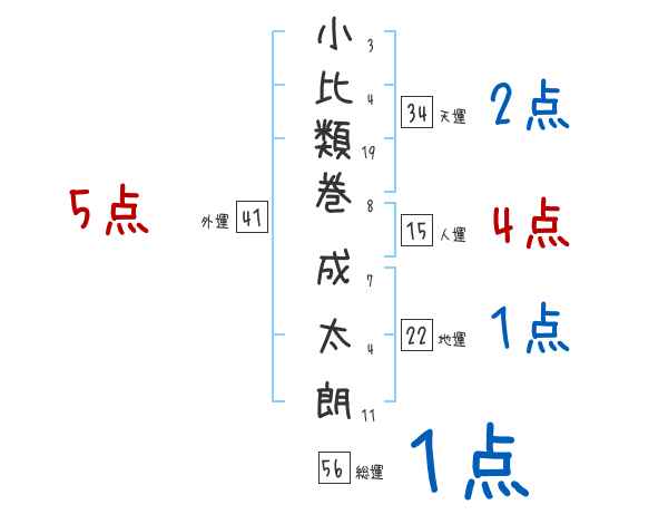 総運![]() | 小比類巻成太朗さんの総運は56画の1つ星!消極的で無気力になりがち。誠実な気持ちが必要でしょう。 あなたの人生を表す1番重要な運勢です。生涯を通じて影響する総合運となり、主に50歳以降の晩年期に影響を及ぼします。 |
