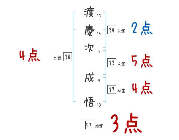 総運![]() | 渡慶次成悟さんの総運は51画の3つ星!変化が激しく、危険に注意。堅実な性格。 あなたの人生を表す1番重要な運勢です。生涯を通じて影響する総合運となり、主に50歳以降の晩年期に影響を及ぼします。 |
