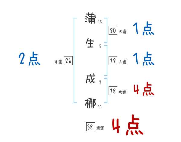 外運![]() | 蒲生成梛さんの外運は26画の2つ星!波瀾万丈かも。信頼できる人を大事にしましょう。 生活面を象徴する運勢です。外部から受ける影響力を表し、結婚運、家庭運や職場、環境への順応性を表します。 |