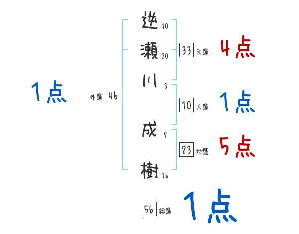 人運![]() | 逆瀬川成樹さんの人運は10画の1つ星!不安を感じやすい傾向。ストレスを抱えないように注意しましょう。 性格や才能などを表す2番目に重要な運勢です。人間関係や協調性、社会的な成功に影響します。主に20歳から50歳ぐらいまでの中年期の運勢を表します。 |