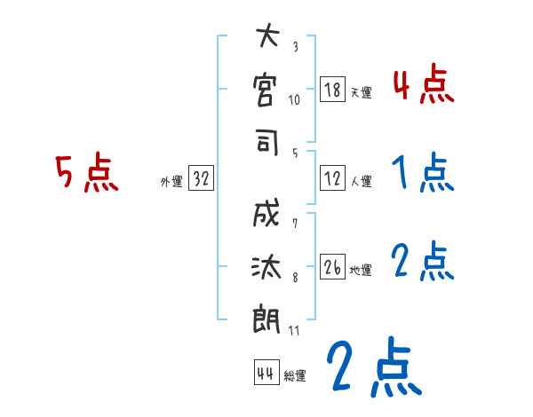 外運![]() | 大宮司成汰朗さんの外運は32画の5つ星!柔軟性があり成功する。チャンスが多く金運が良い。 生活面を象徴する運勢です。外部から受ける影響力を表し、結婚運、家庭運や職場、環境への順応性を表します。 |