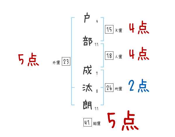 天運![]() | 戸部成汰朗さんの天運は15画の4つ星!人徳があり出世する。順調に物事を進め円満な人生。 家系が持つ宿命的な運勢を表します。祖先から受け継いだ苗字ですので自分の力が及びません。家柄を象徴します。 |