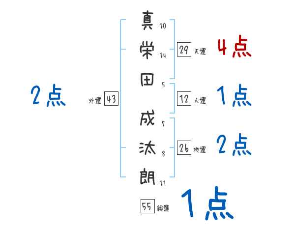 天運![]() | 真栄田成汰朗さんの天運は29画の4つ星!完全主義で才能がある。厳格な心の持ち主。 家系が持つ宿命的な運勢を表します。祖先から受け継いだ苗字ですので自分の力が及びません。家柄を象徴します。 |