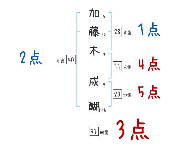 総運![]() | 加藤木成醐さんの総運は51画の3つ星!変化が激しく、危険に注意。堅実な性格。 あなたの人生を表す1番重要な運勢です。生涯を通じて影響する総合運となり、主に50歳以降の晩年期に影響を及ぼします。 |