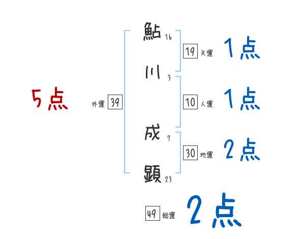 外運![]() | 鮎川成顕さんの外運は39画の5つ星!社交性に優れ人望が厚い。人の上に立ち成功する。 生活面を象徴する運勢です。外部から受ける影響力を表し、結婚運、家庭運や職場、環境への順応性を表します。 |