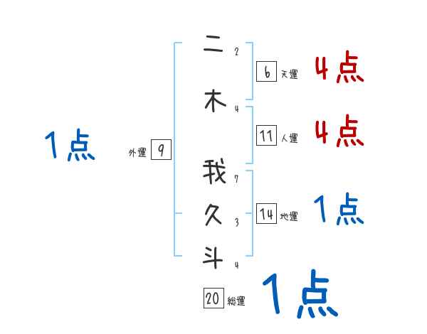 外運![]() | 二木我久斗さんの外運は9画の1つ星!消極的で才能を発揮することが苦手なことも。周りの意見に耳を傾けましょう。 生活面を象徴する運勢です。外部から受ける影響力を表し、結婚運、家庭運や職場、環境への順応性を表します。 |