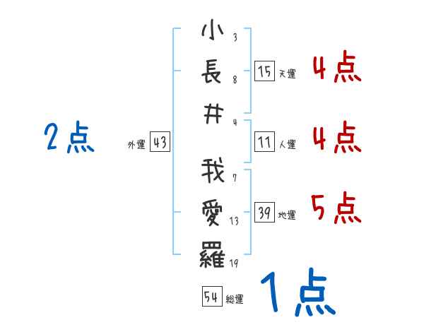 総運![]() | 小長井我愛羅さんの総運は54画の1つ星!トラブルが多いかも。周りをよく見て協調して過ごしましょう。 あなたの人生を表す1番重要な運勢です。生涯を通じて影響する総合運となり、主に50歳以降の晩年期に影響を及ぼします。 |