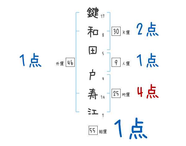 天運![]() | 鍵和田戸寿江さんの天運は30画の2つ星!浮き沈みの激しさに注意しましょう。 家系が持つ宿命的な運勢を表します。祖先から受け継いだ苗字ですので自分の力が及びません。家柄を象徴します。 |