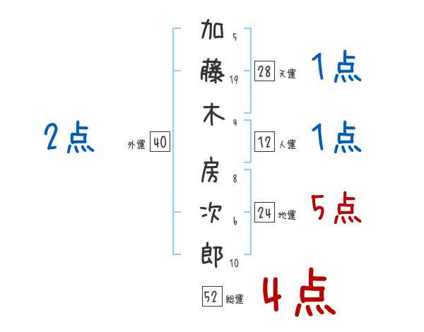 天運![]() | 加藤木房次郎さんの天運は28画の1つ星!家庭環境に注意。スポーツで活躍できる能力があるかも。 家系が持つ宿命的な運勢を表します。祖先から受け継いだ苗字ですので自分の力が及びません。家柄を象徴します。 |