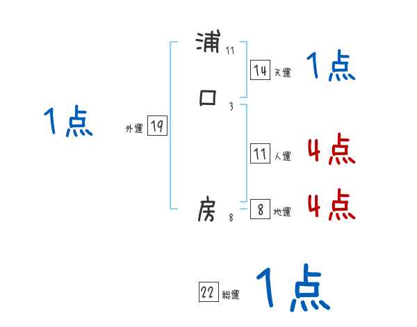 天運![]() | 浦口房さんの天運は14画の1つ星!人に対して優しいがストレスを溜め込みがち。人間関係のトラブルを避けるよう気をつけましょう。 家系が持つ宿命的な運勢を表します。祖先から受け継いだ苗字ですので自分の力が及びません。家柄を象徴します。 |