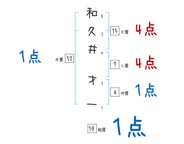 外運![]() | 和久井才一さんの外運は12画の1つ星!簡単な失敗で諦めてしまいやすいかも。着実に行動すると良いでしょう。 生活面を象徴する運勢です。外部から受ける影響力を表し、結婚運、家庭運や職場、環境への順応性を表します。 |