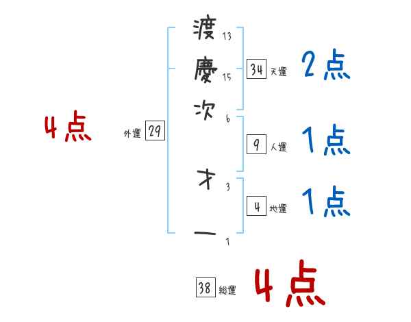 地運![]() | 渡慶次才一さんの地運は4画の1つ星!感情が不安定で苦労するかも。周囲との協調を心掛けましょう。 個性を表す基礎的な運勢です。性格形成や対人関係、行動力など家庭環境に影響されます。主に誕生してから20歳くらいまでの若年期の運勢を表します。 |