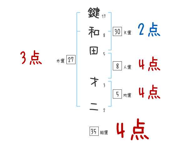 天運![]() | 鍵和田才二さんの天運は30画の2つ星!浮き沈みの激しさに注意しましょう。 家系が持つ宿命的な運勢を表します。祖先から受け継いだ苗字ですので自分の力が及びません。家柄を象徴します。 |