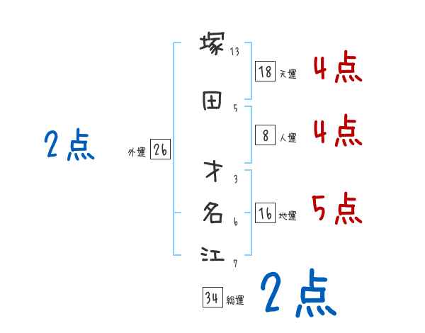総運![]() | 塚田才名江さんの総運は34画の2つ星!独創性に優れるが、自尊心が強く災難に注意しましょう。 あなたの人生を表す1番重要な運勢です。生涯を通じて影響する総合運となり、主に50歳以降の晩年期に影響を及ぼします。 |