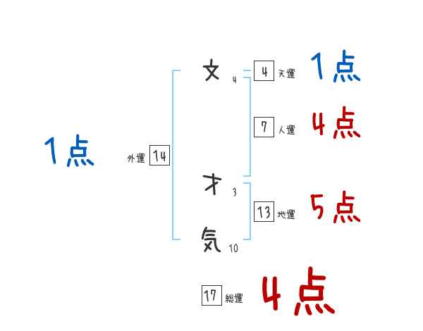 天運![]() | 文才気さんの天運は4画の1つ星!感情が不安定で苦労するかも。周囲との協調を心掛けましょう。 家系が持つ宿命的な運勢を表します。祖先から受け継いだ苗字ですので自分の力が及びません。家柄を象徴します。 |