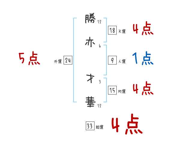 外運![]() | 勝亦才華さんの外運は24画の5つ星!家庭運が良く順調な人生。金運にも恵まれる。 生活面を象徴する運勢です。外部から受ける影響力を表し、結婚運、家庭運や職場、環境への順応性を表します。 |