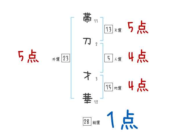 天運![]() | 帯刀才華さんの天運は13画の5つ星!才能に恵まれ人気がある。名声を手に入れる。円満な人生。 家系が持つ宿命的な運勢を表します。祖先から受け継いだ苗字ですので自分の力が及びません。家柄を象徴します。 |