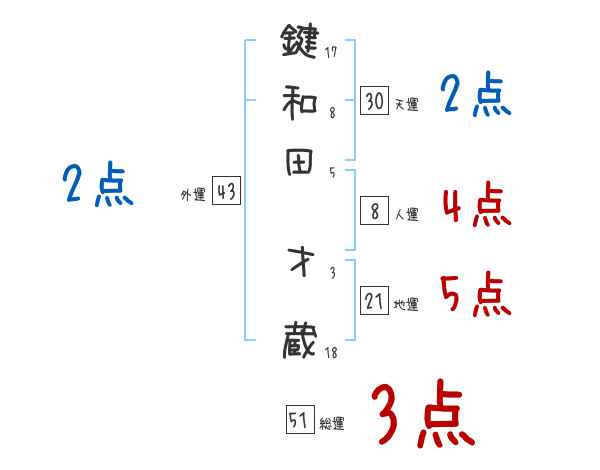 外運![]() | 鍵和田才蔵さんの外運は43画の2つ星!頑固な性格で独立心が強いかも。やや非現実的で浪費に注意しましょう。 生活面を象徴する運勢です。外部から受ける影響力を表し、結婚運、家庭運や職場、環境への順応性を表します。 |