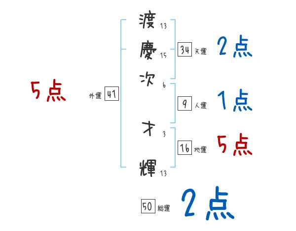総運![]() | 渡慶次才輝さんの総運は50画の2つ星!浮き沈みが激しく不安定。しりすぼみに衰退しやすいので注意しましょう。 あなたの人生を表す1番重要な運勢です。生涯を通じて影響する総合運となり、主に50歳以降の晩年期に影響を及ぼします。 |