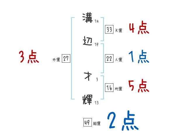 天運![]() | 溝辺才輝さんの天運は33画の4つ星!権力志向でプライドが高い。勇気があり運を切り開き成功する。 家系が持つ宿命的な運勢を表します。祖先から受け継いだ苗字ですので自分の力が及びません。家柄を象徴します。 |