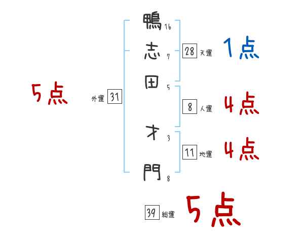 天運![]() | 鴨志田才門さんの天運は28画の1つ星!家庭環境に注意。スポーツで活躍できる能力があるかも。 家系が持つ宿命的な運勢を表します。祖先から受け継いだ苗字ですので自分の力が及びません。家柄を象徴します。 |