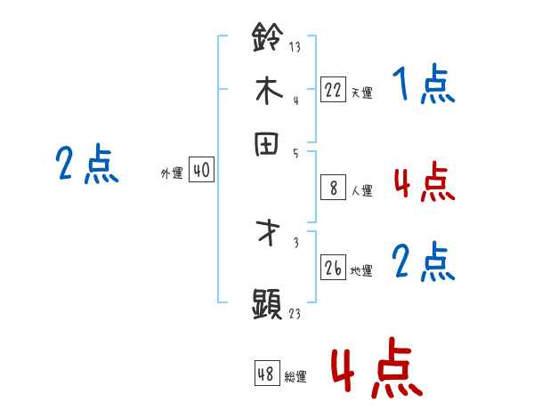 総運![]() | 鈴木田才顕さんの総運は48画の4つ星!賢明な性格で人望が厚い。指導力があり多くの人に尊敬される。 あなたの人生を表す1番重要な運勢です。生涯を通じて影響する総合運となり、主に50歳以降の晩年期に影響を及ぼします。 |