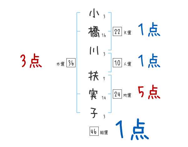 外運![]() | 小橋川扶実子さんの外運は36画の3つ星!先見性が豊かです。多少神経質で苦労することも。 生活面を象徴する運勢です。外部から受ける影響力を表し、結婚運、家庭運や職場、環境への順応性を表します。 |