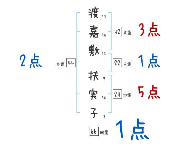 外運![]() | 渡嘉敷扶実子さんの外運は44画の2つ星!誠実で慎重な性格。物事を考えすぎないように注意しましょう。 生活面を象徴する運勢です。外部から受ける影響力を表し、結婚運、家庭運や職場、環境への順応性を表します。 |