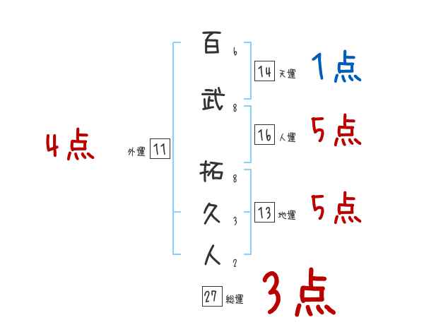 天運![]() | 百武拓久人さんの天運は14画の1つ星!人に対して優しいがストレスを溜め込みがち。人間関係のトラブルを避けるよう気をつけましょう。 家系が持つ宿命的な運勢を表します。祖先から受け継いだ苗字ですので自分の力が及びません。家柄を象徴します。 |