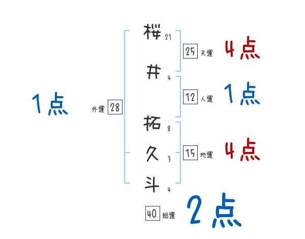 外運![]() | 桜井拓久斗さんの外運は28画の1つ星!家庭環境に注意。スポーツで活躍できる能力があるかも。 生活面を象徴する運勢です。外部から受ける影響力を表し、結婚運、家庭運や職場、環境への順応性を表します。 |