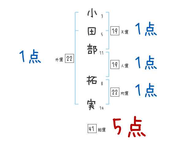 外運![]() | 小田部拓実さんの外運は22画の1つ星!努力することが苦手ないっぽう手先が器用。芸術性にも優れる。 生活面を象徴する運勢です。外部から受ける影響力を表し、結婚運、家庭運や職場、環境への順応性を表します。 |