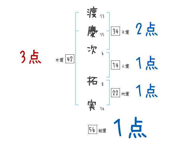 外運![]() | 渡慶次拓実さんの外運は42画の3つ星!病気に注意。多芸であるが消極的でおとなしい。 生活面を象徴する運勢です。外部から受ける影響力を表し、結婚運、家庭運や職場、環境への順応性を表します。 |