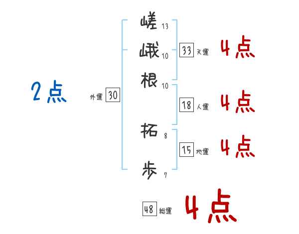 外運![]() | 嵯峨根拓歩さんの外運は30画の2つ星!浮き沈みの激しさに注意しましょう。 生活面を象徴する運勢です。外部から受ける影響力を表し、結婚運、家庭運や職場、環境への順応性を表します。 |