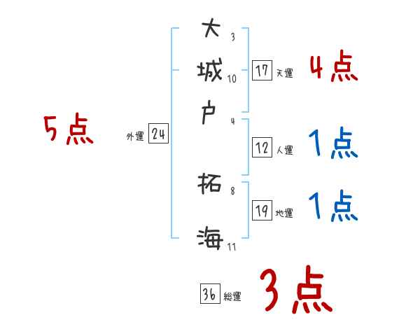 総運![]() | 大城戸拓海さんの総運は36画の3つ星!先見性が豊かです。多少神経質で苦労することも。 あなたの人生を表す1番重要な運勢です。生涯を通じて影響する総合運となり、主に50歳以降の晩年期に影響を及ぼします。 |