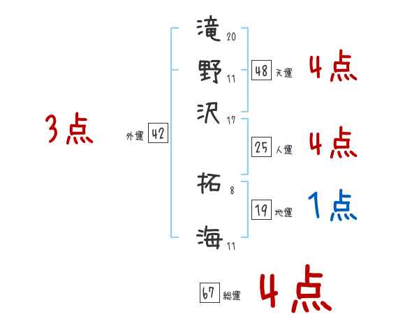 外運![]() | 滝野沢拓海さんの外運は42画の3つ星!病気に注意。多芸であるが消極的でおとなしい。 生活面を象徴する運勢です。外部から受ける影響力を表し、結婚運、家庭運や職場、環境への順応性を表します。 |