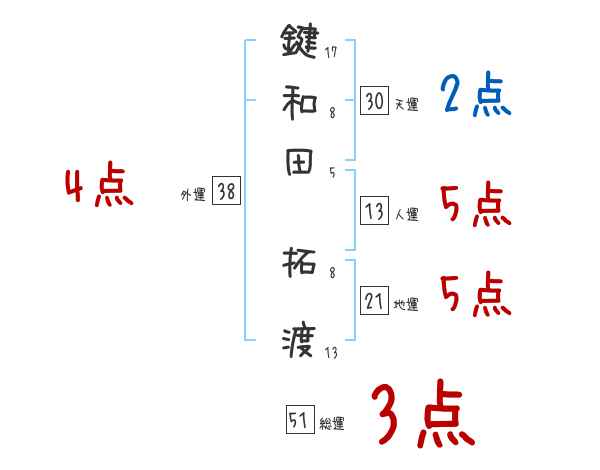 鍵和田拓渡さんの画数の鑑定結果