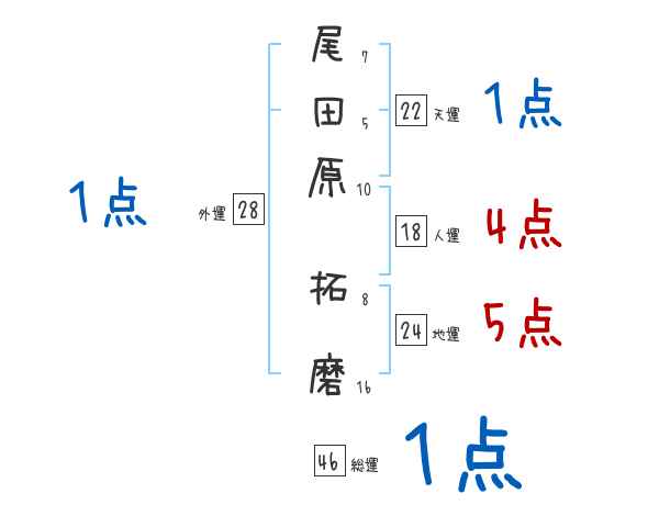 天運![]() | 尾田原拓磨さんの天運は22画の1つ星!努力することが苦手ないっぽう手先が器用。芸術性にも優れる。 家系が持つ宿命的な運勢を表します。祖先から受け継いだ苗字ですので自分の力が及びません。家柄を象徴します。 |