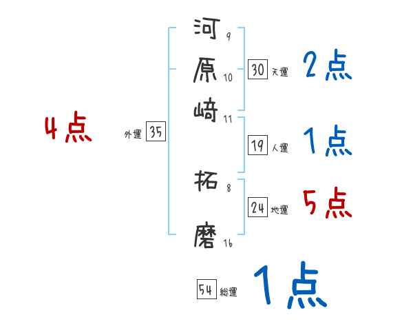 天運![]() | 河原﨑拓磨さんの天運は30画の2つ星!浮き沈みの激しさに注意しましょう。 家系が持つ宿命的な運勢を表します。祖先から受け継いだ苗字ですので自分の力が及びません。家柄を象徴します。 |
