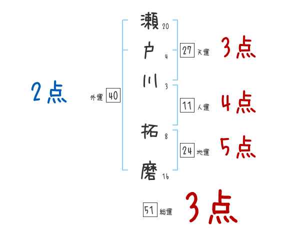 天運![]() | 瀬戸川拓磨さんの天運は27画の3つ星!頭脳明晰だが強情で摩擦が多い傾向。孤立に注意。 家系が持つ宿命的な運勢を表します。祖先から受け継いだ苗字ですので自分の力が及びません。家柄を象徴します。 |