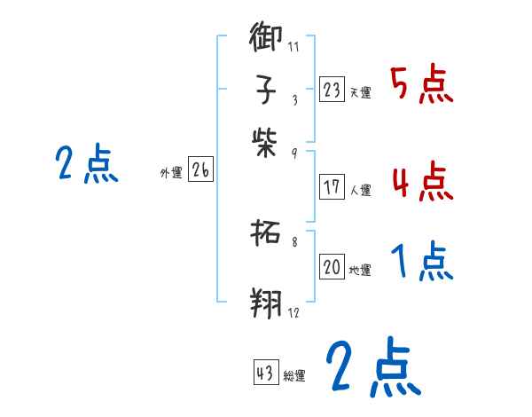 外運![]() | 御子柴拓翔さんの外運は26画の2つ星!波瀾万丈かも。信頼できる人を大事にしましょう。 生活面を象徴する運勢です。外部から受ける影響力を表し、結婚運、家庭運や職場、環境への順応性を表します。 |
